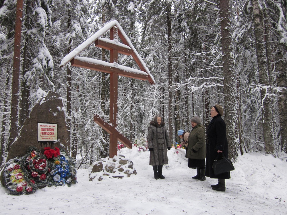 On 14 October 1989 the exhumed remains were reburied where they were found. A post bearing an inscription was placed nearby (“Victims of NKVD-KGB repression in 1937-1938 lie buried here”) with two stones indicating the common graves. That day a granite pillar was placed among the grave mounds, the first memorial to the victims of political repression in Karelia: “In memory of the victims of repression in the Pudozh district in the 1930s and 1940s”.
