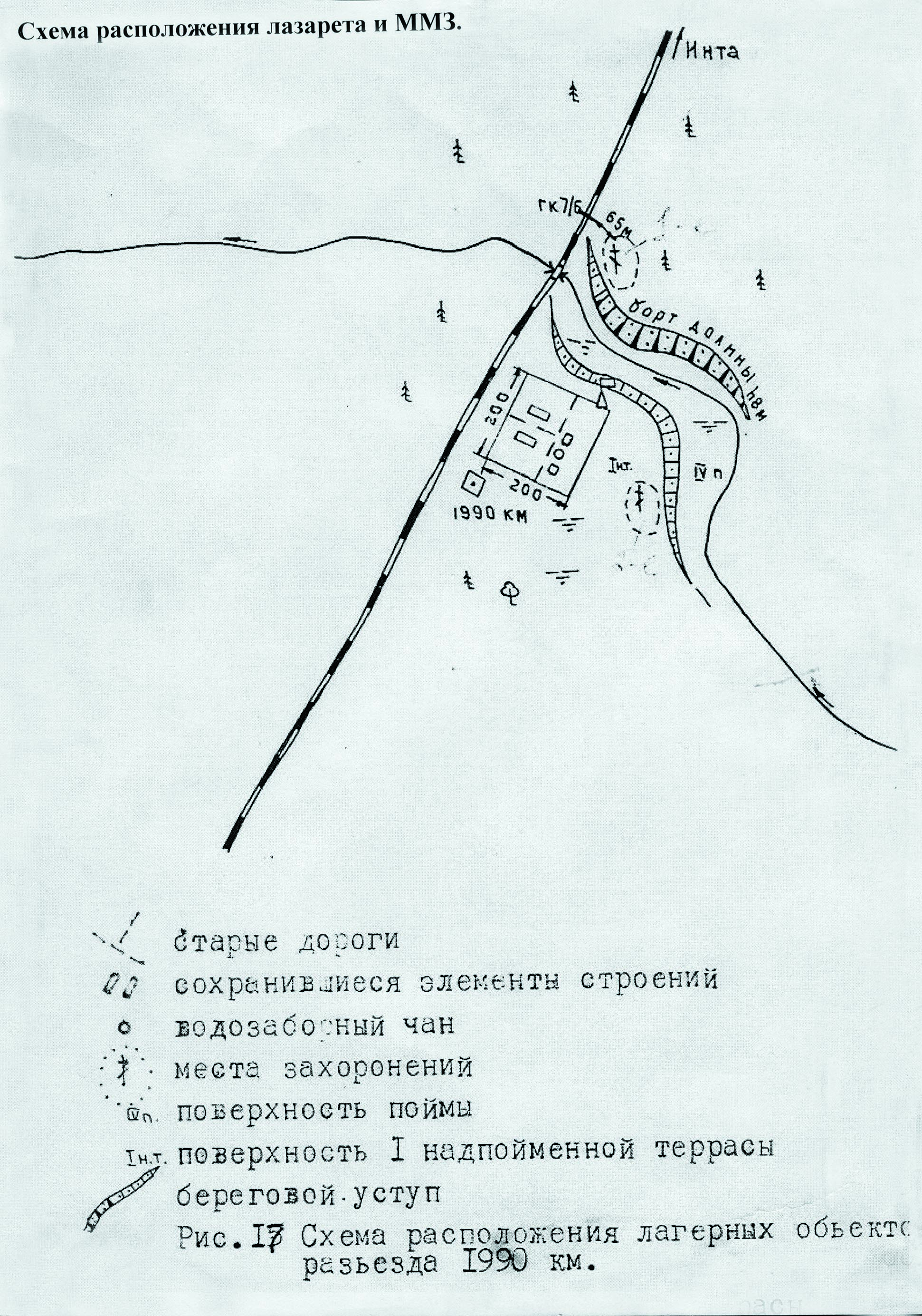 The camp outpost at the 1990 km rail loop was part of the Sevpechlag (after 1950 Pechorlag) system. The prisoners burial ground is located southeast of the camp on both banks of the Besymyanny stream. Traces of burials have survived and several grave crosses. The numbers buried there have not been established.