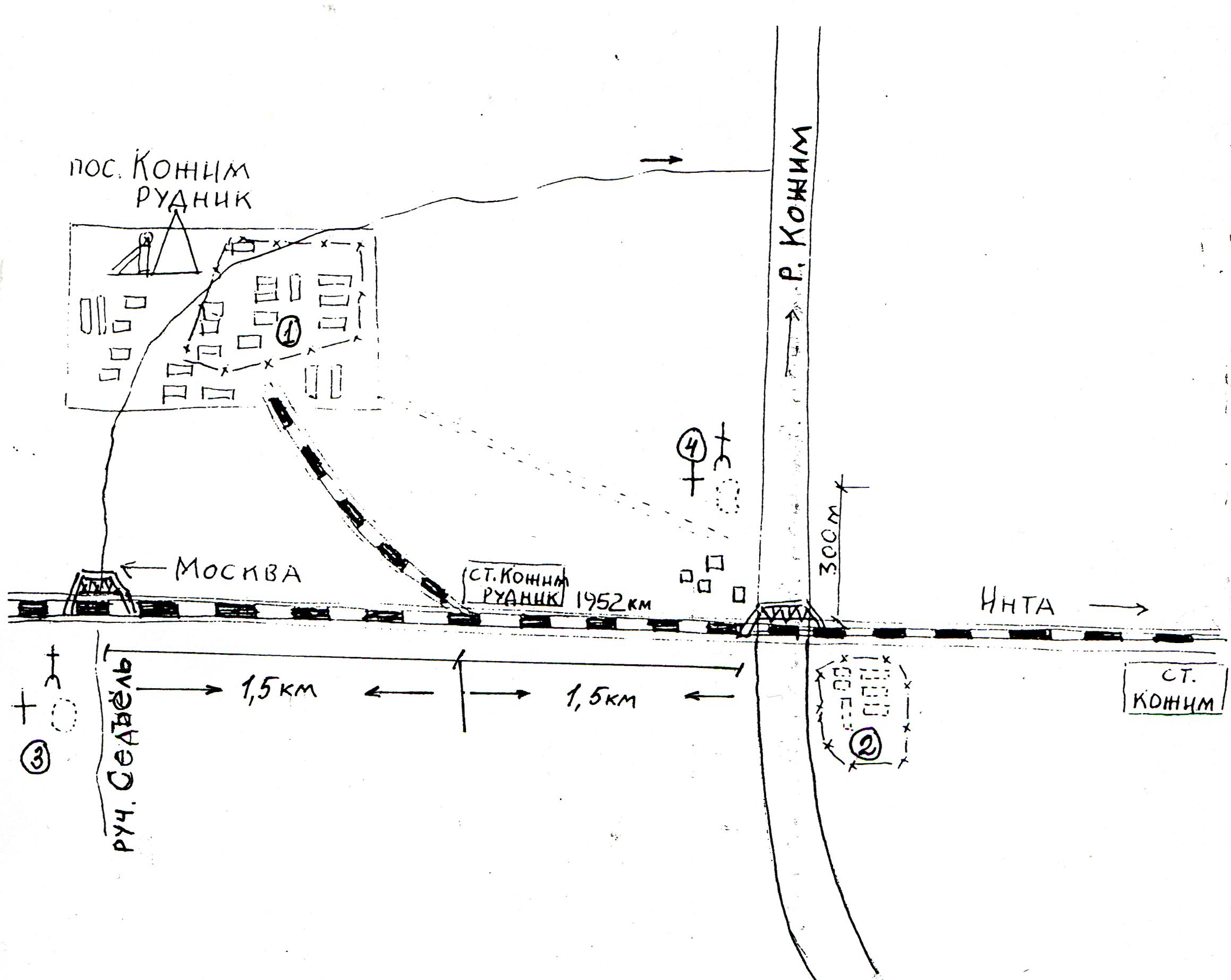(In 2000 Aduyeva drew up a plan of Kozhym Rudnik rail station at the 1952 km from Moscow and the surrounding camp installations: [1] the mine and nearby camp, [2] a second camp across the Kozhim River, and [3 & 4] the burial grounds. The railroad running to Moscow and to Inta is shown at the base of the plan.)