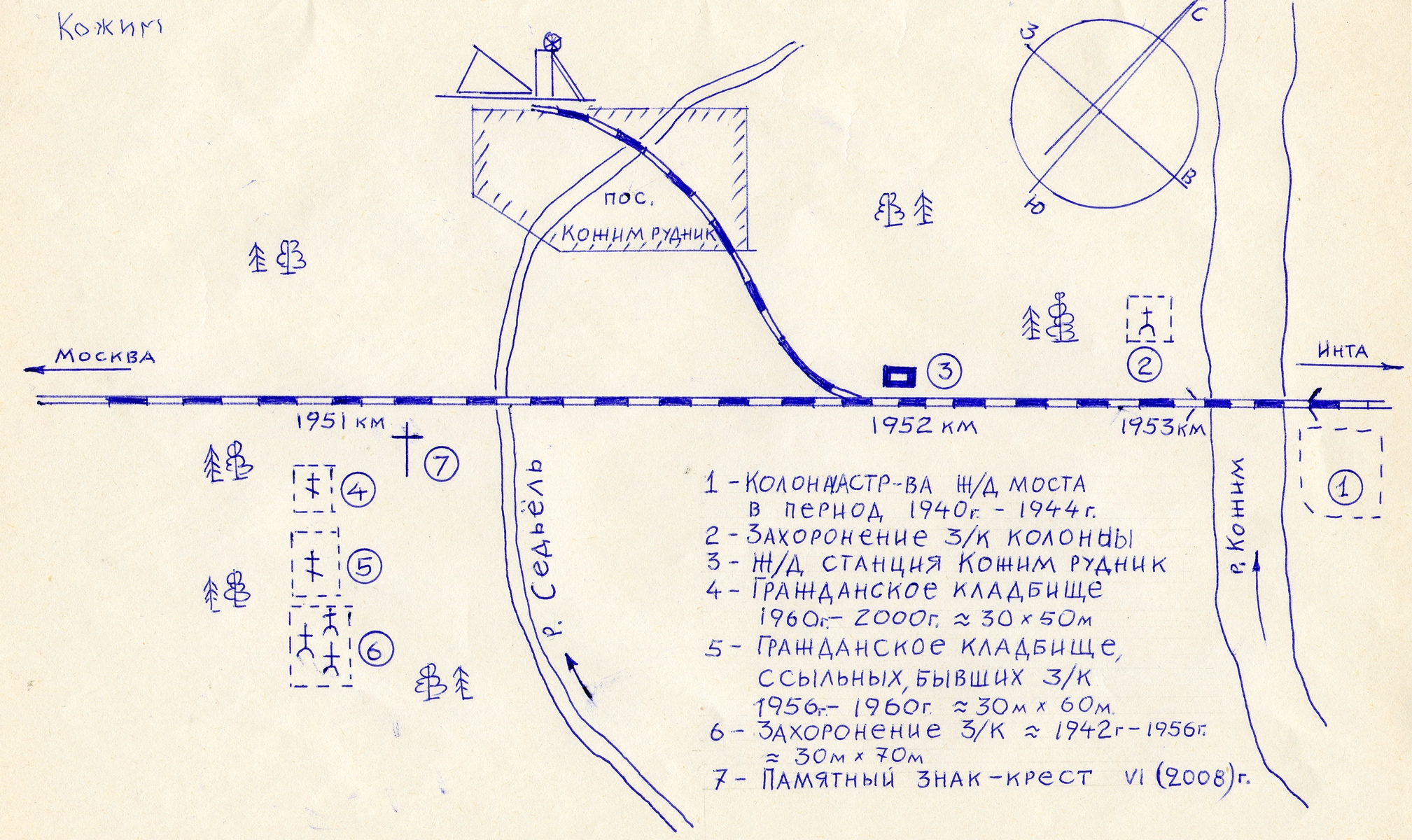 (The map of the area shows the location of: [1] the bridge construction brigade, 1940-1944; [2] the burial ground of the imprisoned bridge builders; [3] the rail station; [4] the civilian graveyard, 1960s to 2000; [5] the civilian graveyard, 1956-1960; [6] prisoners burial ground, 1942-1956; and [7] the 2008 commemorative cross; in relation to the railroad and the Sedyol and Kozhim rivers. Drawn by N.A. Baranov in 2008.)