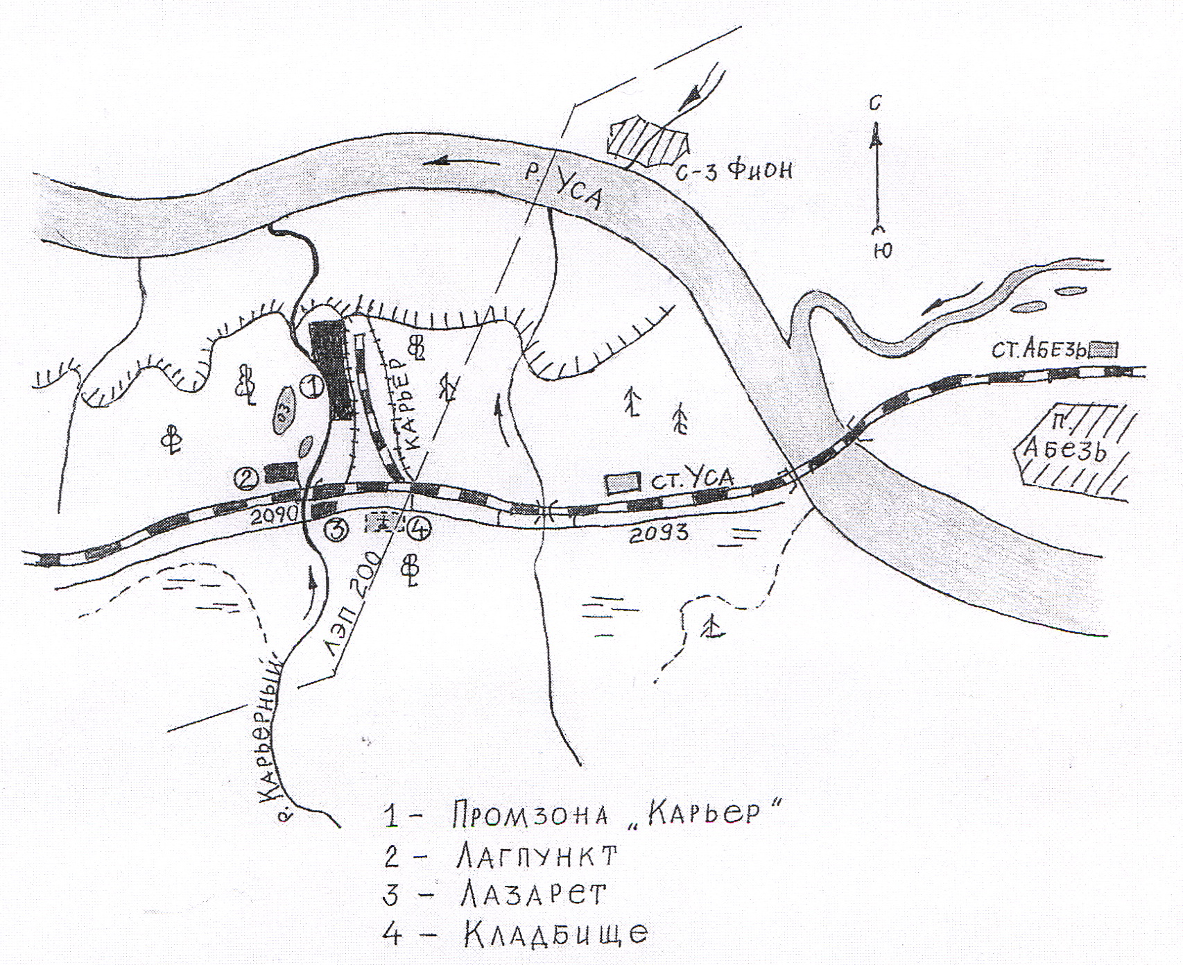 Prisoners of the Usinsky camp outpost of Pechorzheldorlag who died in the camp infirmary in the 1940s and early 1950s were buried in a cemetery 500 metres away. The barracks where the prisoners lived were on the other side of the railway. The camp outpost was closed in the mid-1950s.