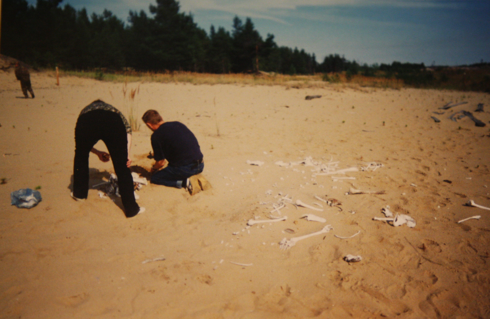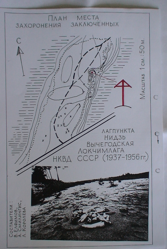 Inhabitants of the surrounding villages gathered the remains of those buried as they came to the surface and on three occasions (1997, 2001, 2006) they reburied them in common graves on the edge of the former quarry. In 2006 a metal cross was erected with a board on which the following words were written: “Burials of the Ust-Lokchim camp. Nidz-Vychegodskaya. 1938-1959”.