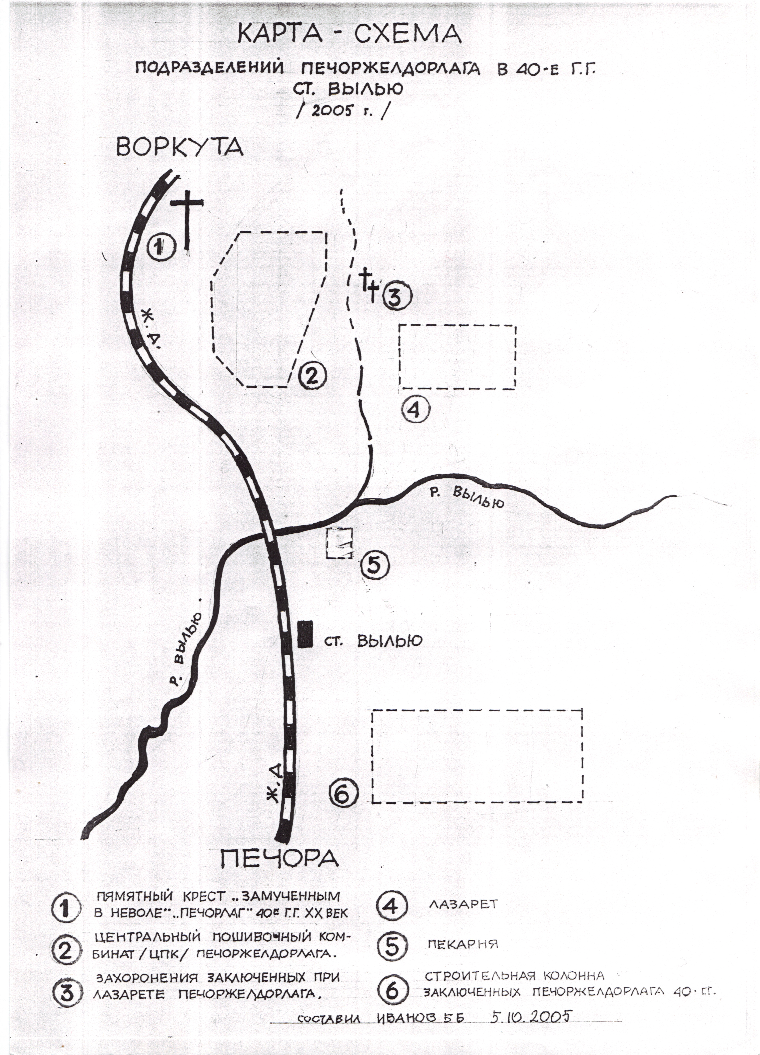 (The map of Pechorzheldorlag in the 1940s shows: [1] commemorative cross; [2] the central sewing combine; [3] burials next to [4] the infirmary centre; [5] bakery; and [6] construction brigade, in relation to the Vylyu rail station and the Vylyu river. Drawn by B.B. Ivanov in 2005.)