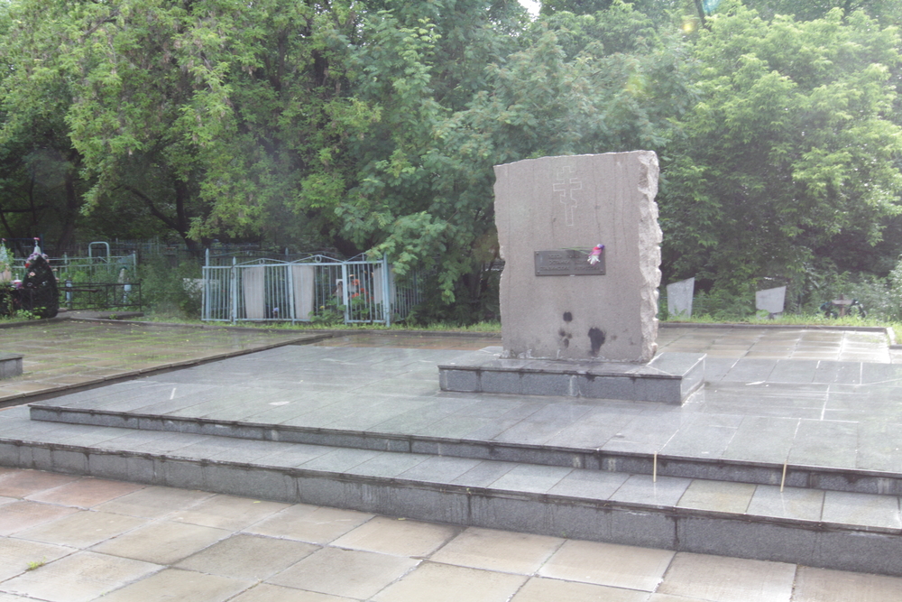 In June 1990, the remains of 68 individuals shot during the Great Terror, discovered in the courtyard of the former building of the Biisk NKVD [22-05], were buried in a common grave. A temporary memorial (a cross and a nameboard) was erected and the Biisk Memorial Society began to raise funds for a permanent monument. In 1994, a granite pillar with the inscription “Here lie the remains of the victims of Stalinist repression” was erected. It was formally opened on 30 October that year. (Nearby stands a memorial to soldiers who died in the military hospitals of Biisk during the 1941-1945 war.)