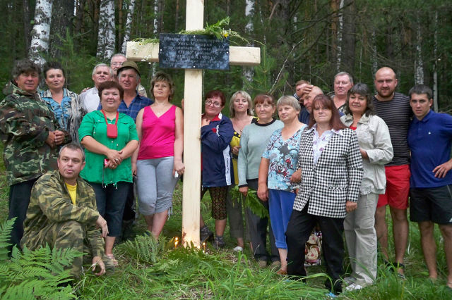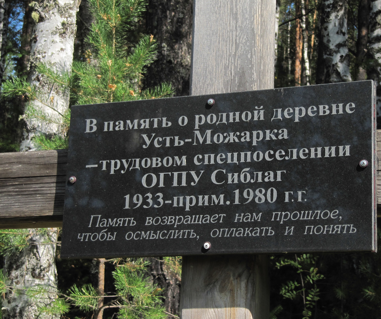 On 6 July 2012 Nadezhda Chernykh (Bakhmetyeva) and Ivan Cheremisin, descendants of those sent to Mozharka, erected a memorial cross in the graveyard on Mount Badanka. The cross was made from a small tree trunk. The black marble plaque fixed to it reads: “In memory of our native village Ust-Mozharka, an OGPU labour colony of Siblag, 1933-1980 (approx.). Memory returns the past to us so that we may consider, mourn and understand what happened”.