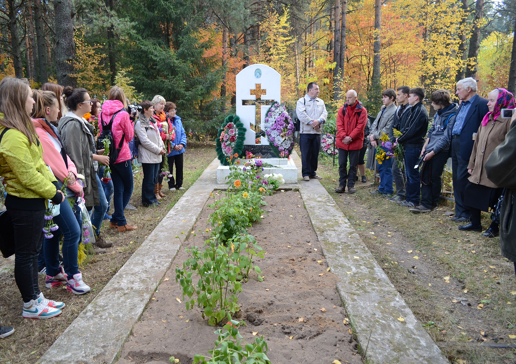 The burials were uncovered in 1996 by schoolchildren, members of the “Explorer” group led by O.A. Ugryumov, who interviewed old villagers. That year a cross was erected on the burial site, funded by the district Council of Veterans, donations by individuals and businesses in the district, with the support of the district administration and the “Explorer” group. Before the memorial was installed the trench was filled in and the area was levelled. The memorial is a concrete pillar pierced by an Orthodox cross; the plaque at its base reads, “To the victims of political repression, 1929-1937”.