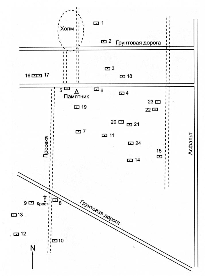In the late 1980s eyewitnesses reported the location of the burials. At the urging of the chairman of the Voronezh Memorial society, V.I. Bityutsky, exploratory work began. The first burial was found on 6 September 1989 and by 18 October another ten had been discovered. In 1990-1993 24 pits, containing 924 bodies as well as fragments of clothing and personal items, were located and opened. The regional budget financed the work. Exploratory groups engaged in the search received active support from Memorial. Each year new-found remains were solemnly reburied according to Orthodox rites in the location of their discovery. Several large coffins bearing the remains of many people were lowered into each grave and a plaque was placed over it: “Here lie the remains of [number] people”.
