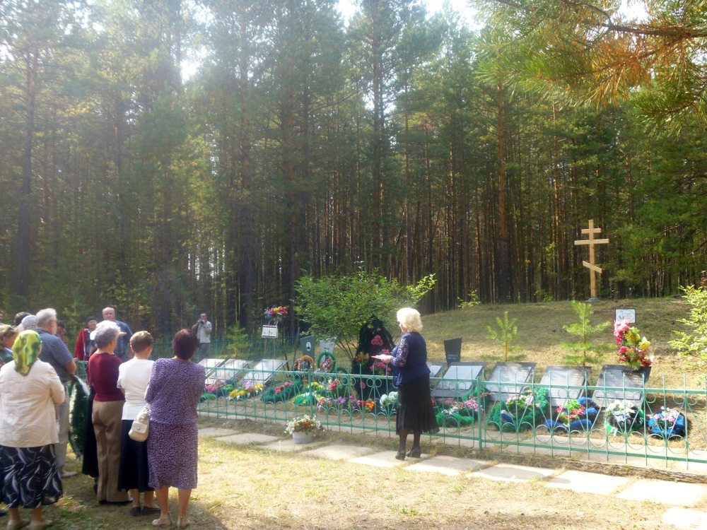 The Kirensk town executive committee set up a commission to organise the reburial of the victims. A list of names and short biographies of the 26 known victims was published in the Sovetskaya molodyozh newspaper. After specialist analysis was completed, the remains were reburied on 26 May 1991 in a common grave in the town (Khabarovskoe) cemetery. On the mound in the centre of the grave a wooden Orthodox cross was erected; below memorial plaques carried the names of the victims. A few individual memorials have been placed at the foot of the cross, presumably by relatives of the victims.