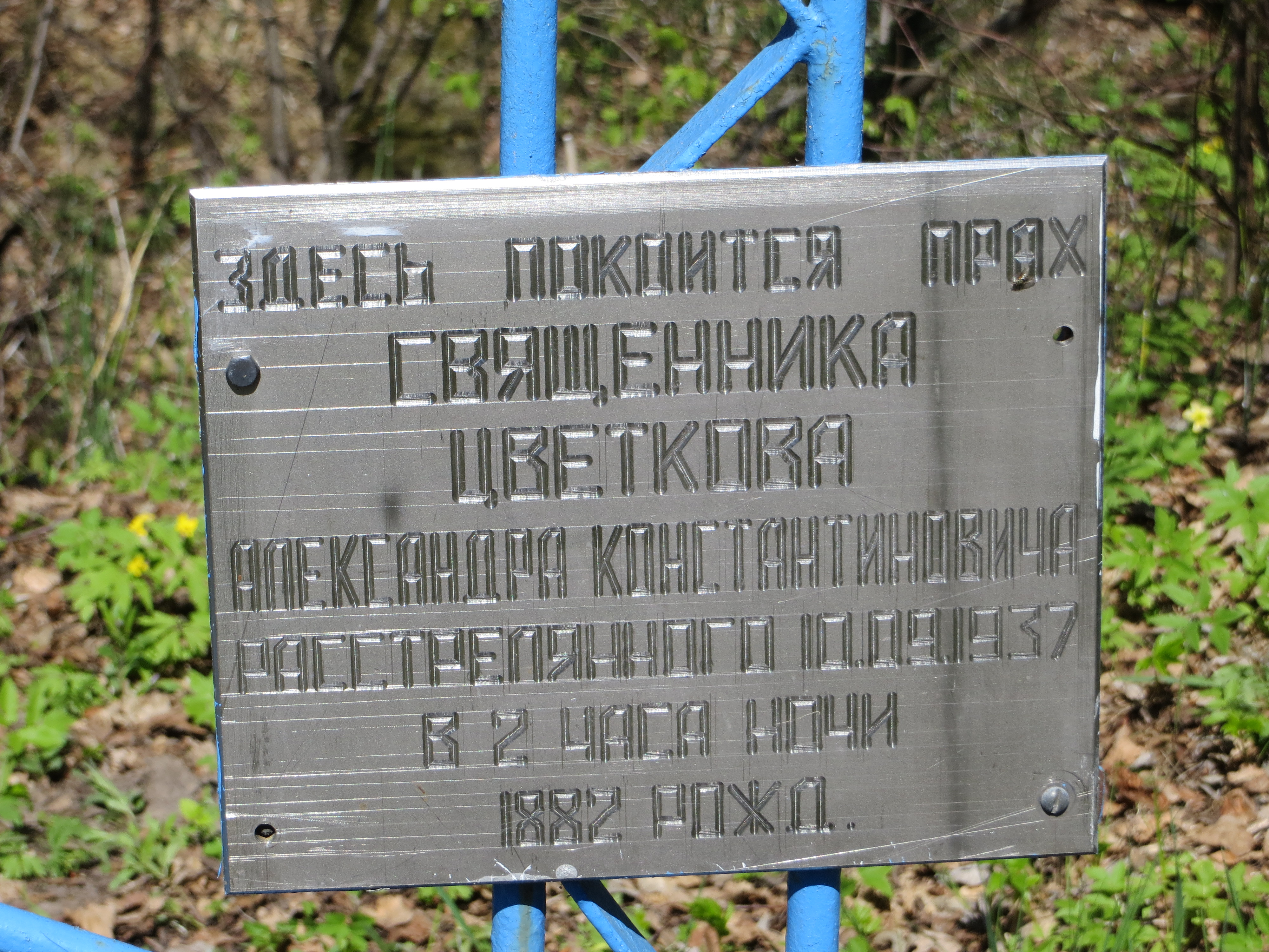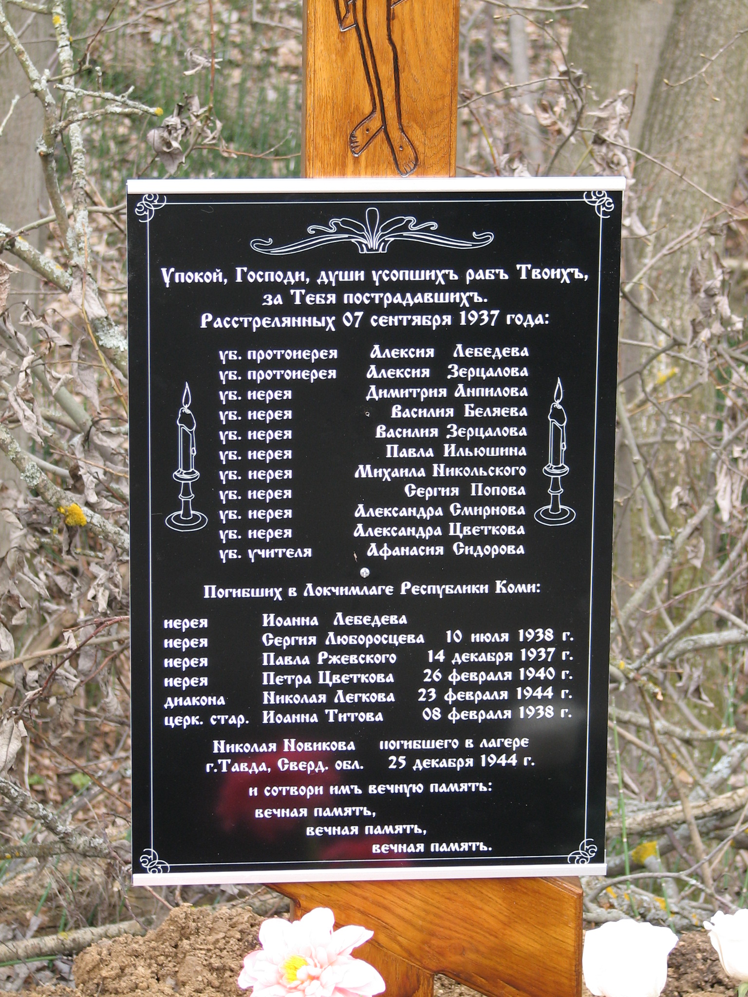 “Grant peace, O Lord, to the souls of thy servants who perished here, suffering for your sake and shot on 7 September 1937: Archpriest Alexy Lebedev; Archpriest Alexy Zertsalov, Father Dimitry Anpilov, Father Vasily Belyaev, Father Vasily Zertsalov, Father Pavel Ilyushin, Father Mikhail Nikolsky, Father Sergei Popov, Father Alexander Smirnov, Father Alexander Tsvetkov and the teacher Afanasy Sidorov.