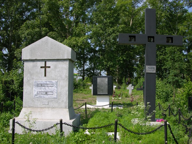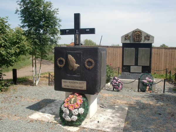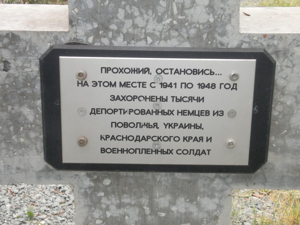 The first monument to German forced labourers was opened on 27 August 2000 on a plot of 0.6 hectares purchased by the Vozrozhdenie Society of Yurga Germans and the association of former Yurga dwellers (chairman Josif Tserr, Hannover). Three years later the Victims of War memorial complex was formally opened in summer 2003 (11 crosses and a memorial). Inscriptions in Russian and German on the cross read “Eternal Peace in a Foreign Land” (Ewige Ruhe in fremder Erde) and on the memorial, “Here lie far from the Motherland in God’s Peace” (Hier ruhen in Gott fern der Heimat).