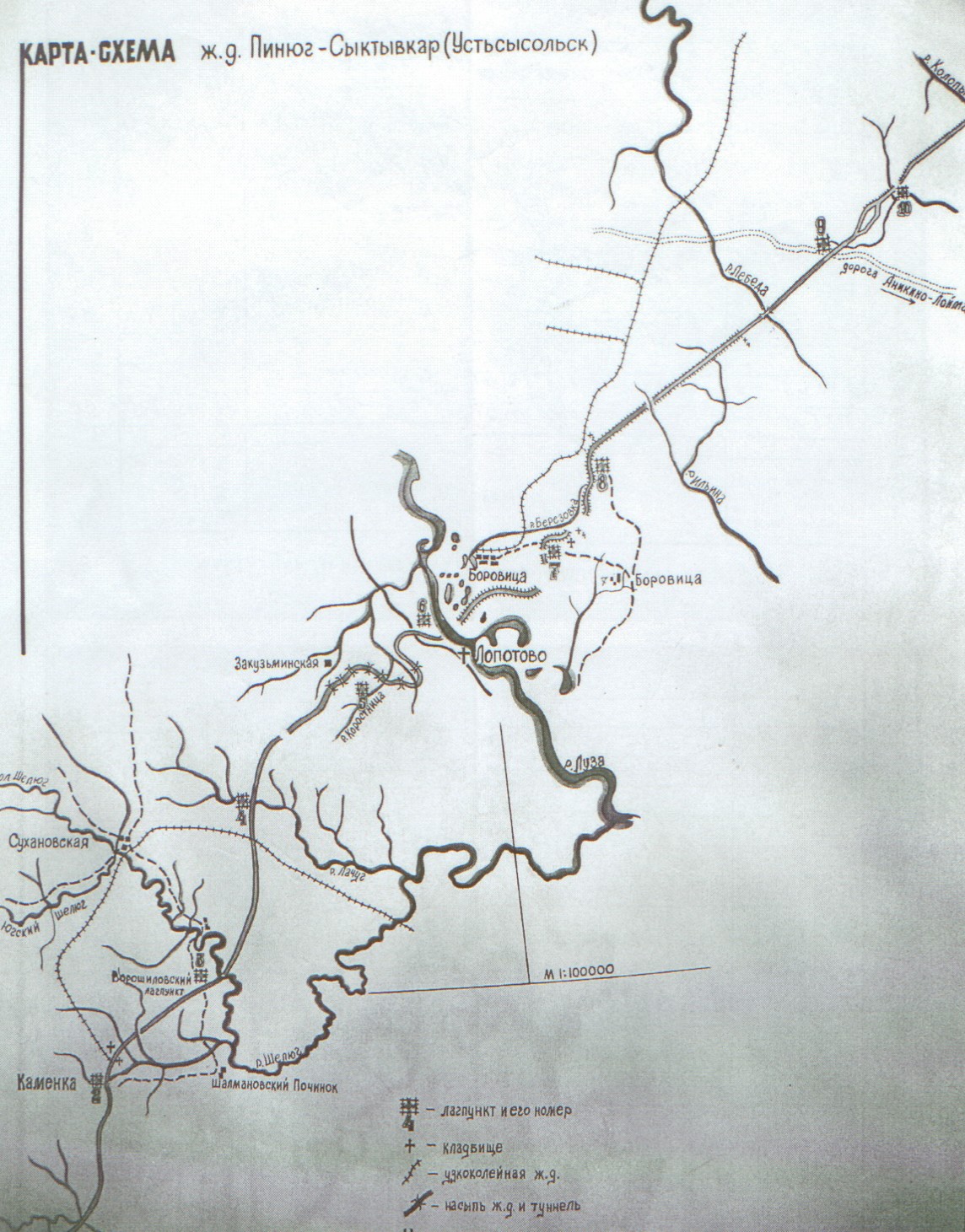 In 1929-1931, camp outpost No 2 of the Pinyug division of the Northern Camp Directorate (USEVLON) was located near the Pinyug rail station. Its inmates were building the branch line between Pinyug and Ust-Sysolsk (today Syktyvkar). The camp burial ground was located in the woods. The exact number buried there is unknown.