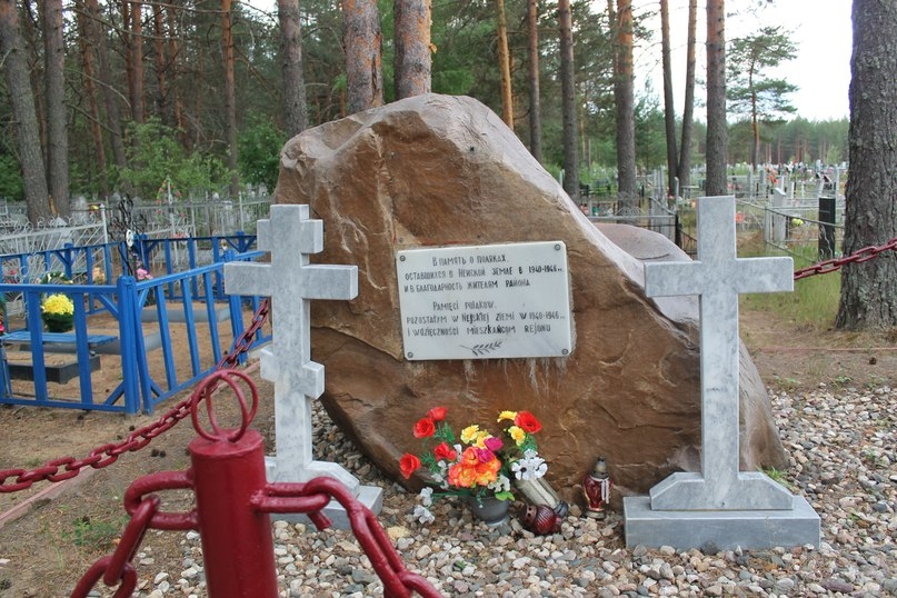 On 27 May 2007, thanks to the efforts of Tadeusz Rzeszutek, a former deportee, a monument was placed in the cemetery in memory of those Poles who died in exile. The memorial plaque bears the following words in Russian and Polish: “In memory of the Poles who spent 1940-1946 in the Neisky district and in gratitude to its inhabitants / Рamięci polakow, рozostatym w Nejskiej ziemi w 1940-1946 rr. i wdzięczności mieszkańcom rejona”. To either side of the memorial stand two crosses, one Catholic, the other Orthodox. The Union of Siberians in Sulecin (Poland) funded the memorial.