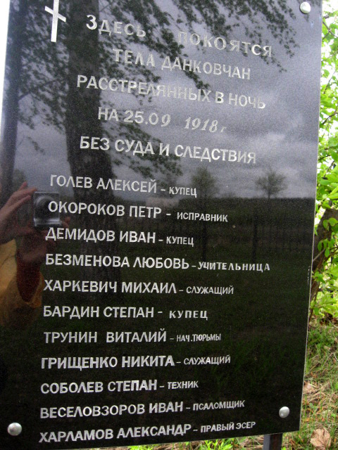 The inscription reads: “Here lie the bodies of citizens of Dankov who were shot without investigation or trial on the night of 25 September 1918”.