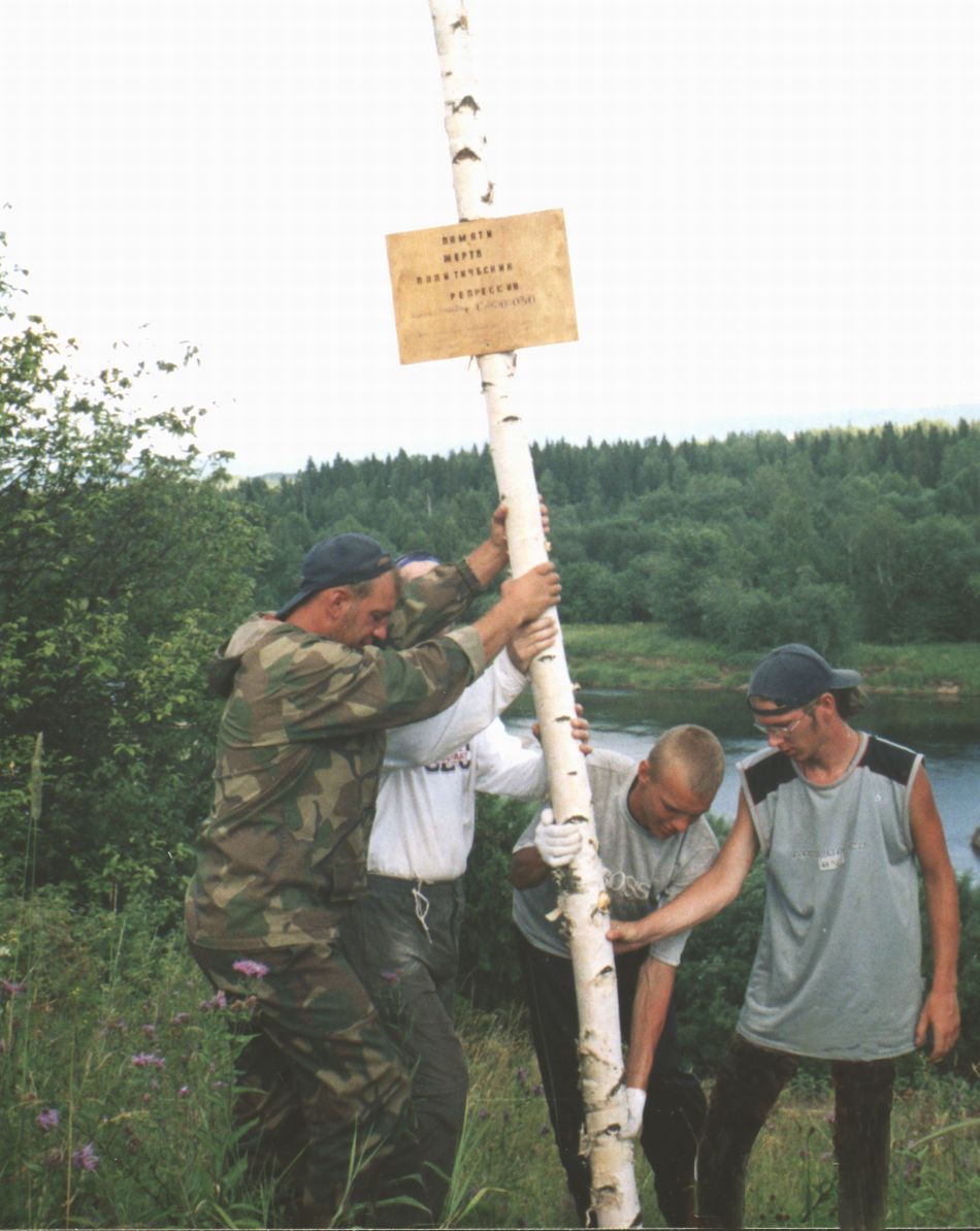 In 2004, a wooden post bearing an explanatory board was erected at the graveyard by members of the Perm Youth Memorial, taking part in a “Rivers of Memory” expedition. In 2007, members of Perm Youth Memorial, again part of a Rivers of Memory expedition, and the Olympus hiking club from Alexandrovsk, replaced the first sign with a cross made of birch. The attached board reads: