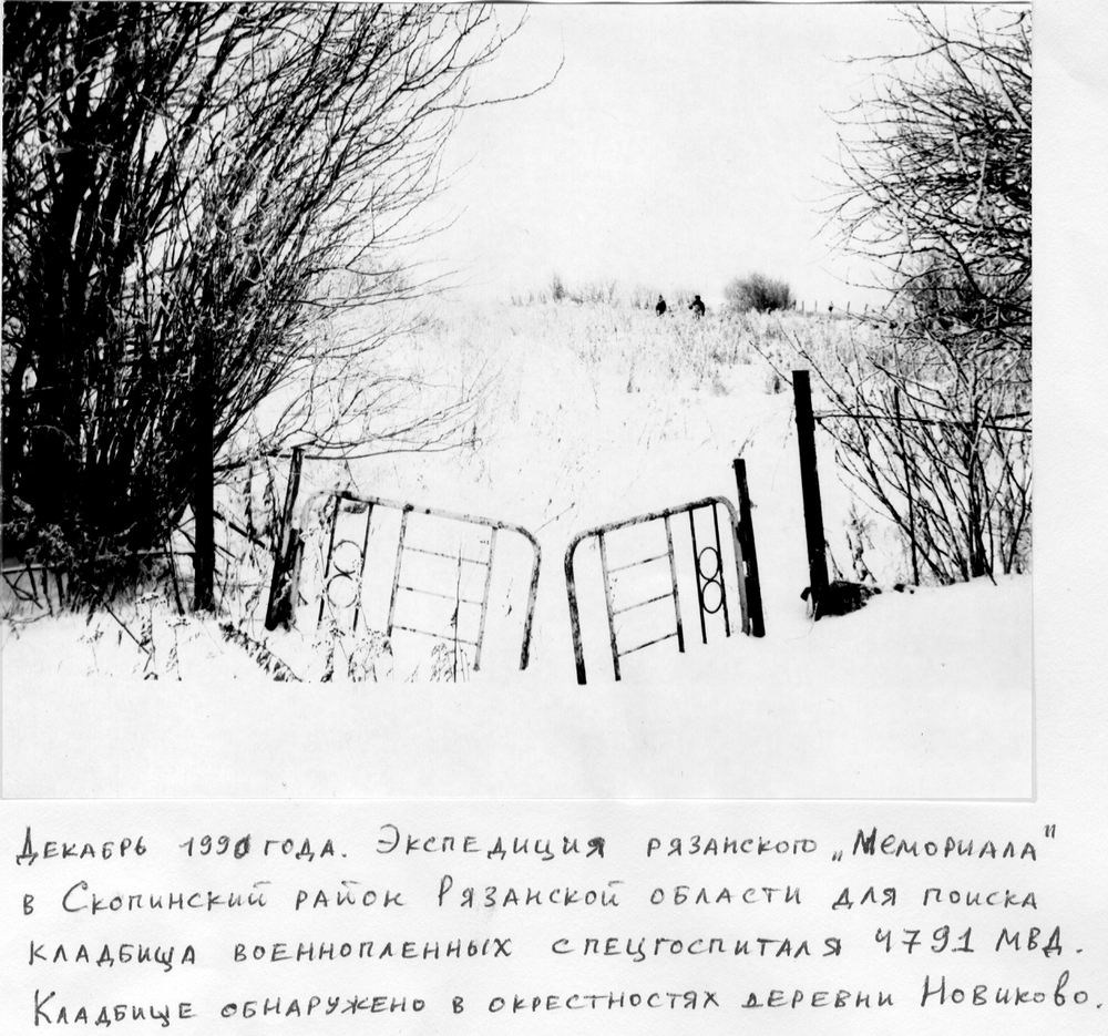 From 1944 to 1949 a special NKVD hospital (No. 47-91) for POWs and internees functioned in the Novikovo settlement. Prisoners from camp division No. 178-454 (Ryazan-Dyagilevo) and certain other camps in the Ryazan, Tula and other regions were also sent there. 264 POWs and interned persons lie buried in the hospital cemetery: 201 Germans, 46 Poles, 9 Hungarians and 8 Austrians. POWs and interned persons who died in transit (20 individuals without documents whose names are unknown) were unloaded from troop trains at Skopin rail station, 3.5 kilometres away, and also buried in the cemetery.