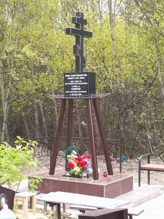On the mayor’s instructions the remains were reburied on 20 December 2002 in the Baktinsky cemetery. A wooden cross was erected over the common grave with a metal plaque that read: “Here lie the remains of the dead, discovered by excavation in the Kashtak residential district in 1995”. On 24 September 2008 thanks to the efforts of the Tomsk Memorial society, with the support of the Regional and City Dumas, a memorial (designer V. Miller) was erected. Paid for by the city administration. It bears an inscription, “Your names are unknown, but your memory lives on. Here lie the remains of those found in Kashtak in 1995, a place of mass execution in the 1920s-1940s”.