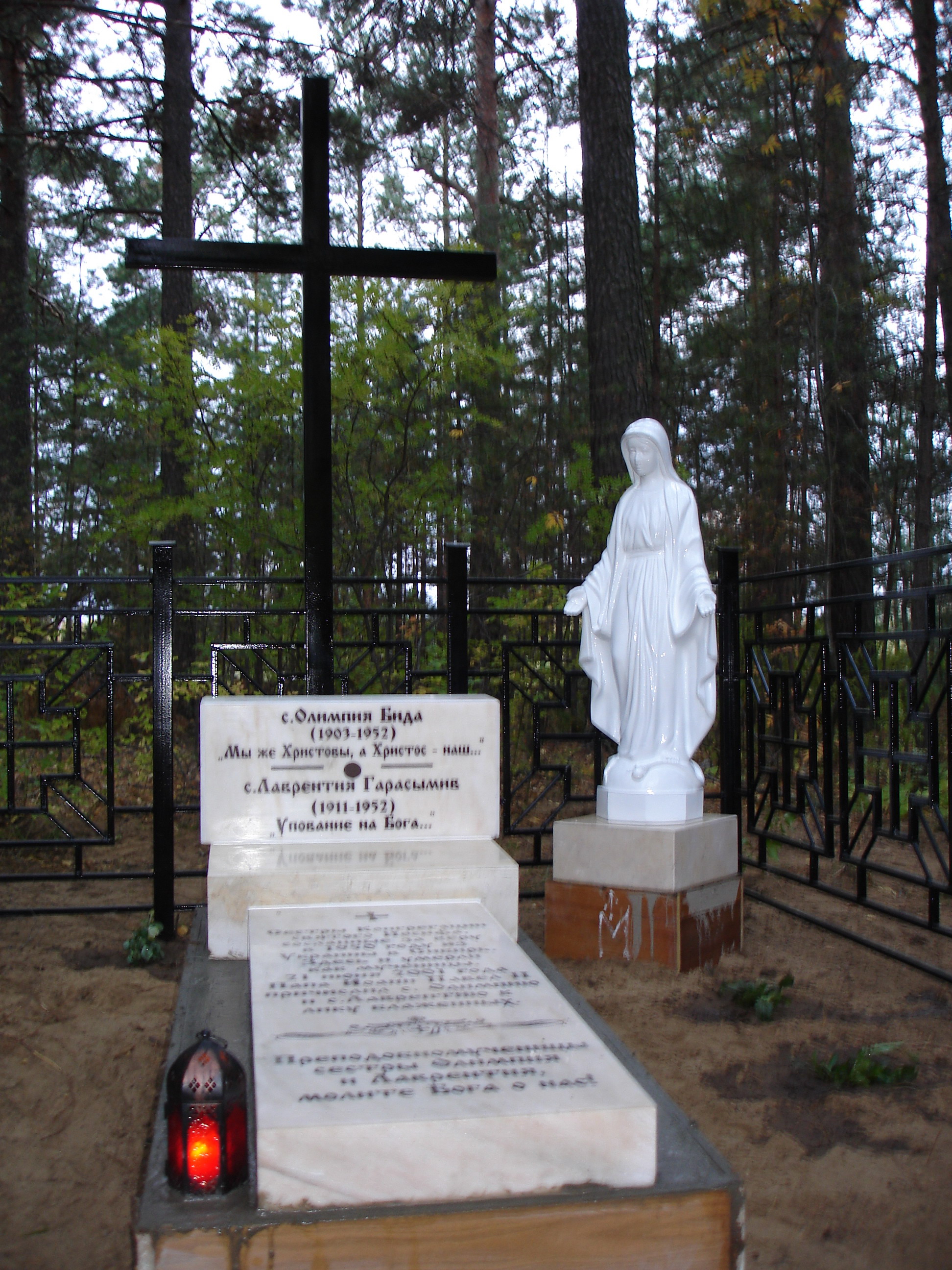 Before their arrest in 1950 Sisters Olympia Bida and Lavrentia Gerasimiv of the Holy Congregation of St Joseph (Graeco-Catholic Church) were secret members of a monastic community in Khyrov, West Ukraine. They were sentenced to perpetual exile, died in Kharsk and were buried in the village graveyard.