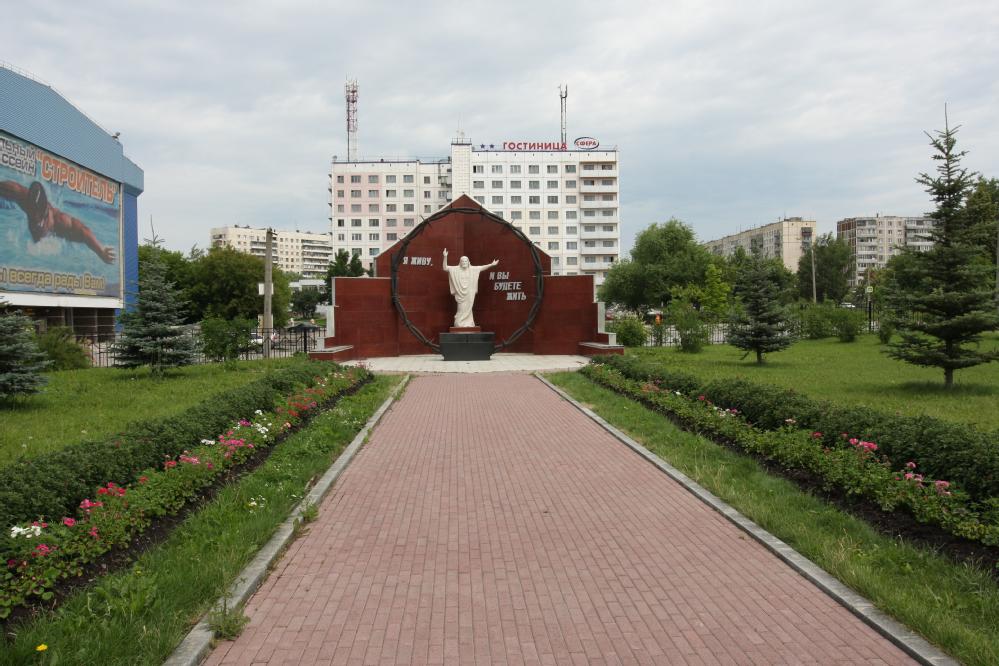 A container holding ashes from the common grave at the cemetery of the Bakallag forced labourers and prisoners [74-10] was reburied under the symbolic altar of the memorial complex to Soviet German forced labourers in Chelyabinsk. The memorial, created in 2004, is located in the grounds of the church of the Immaculate Conception of the Holy Virgin Mary. Pastor Wilhelm Palesh proposed the idea and is one of the designers of the memorial. The church is located where forced labourers at the metallurgical combine were based.