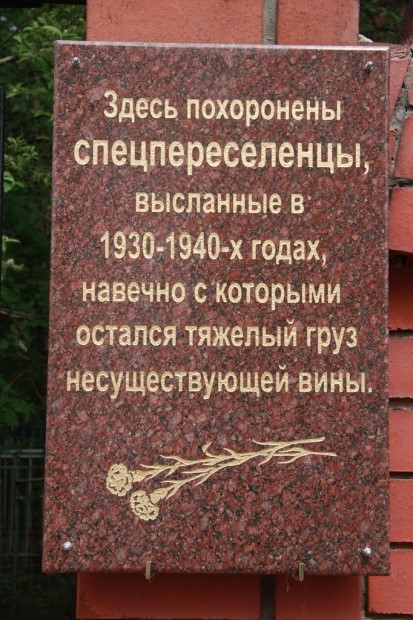 “Here lie forced settlers, deported in the 1930s and 1940s, who forever bear the heavy burden of a non-existent guilt”.